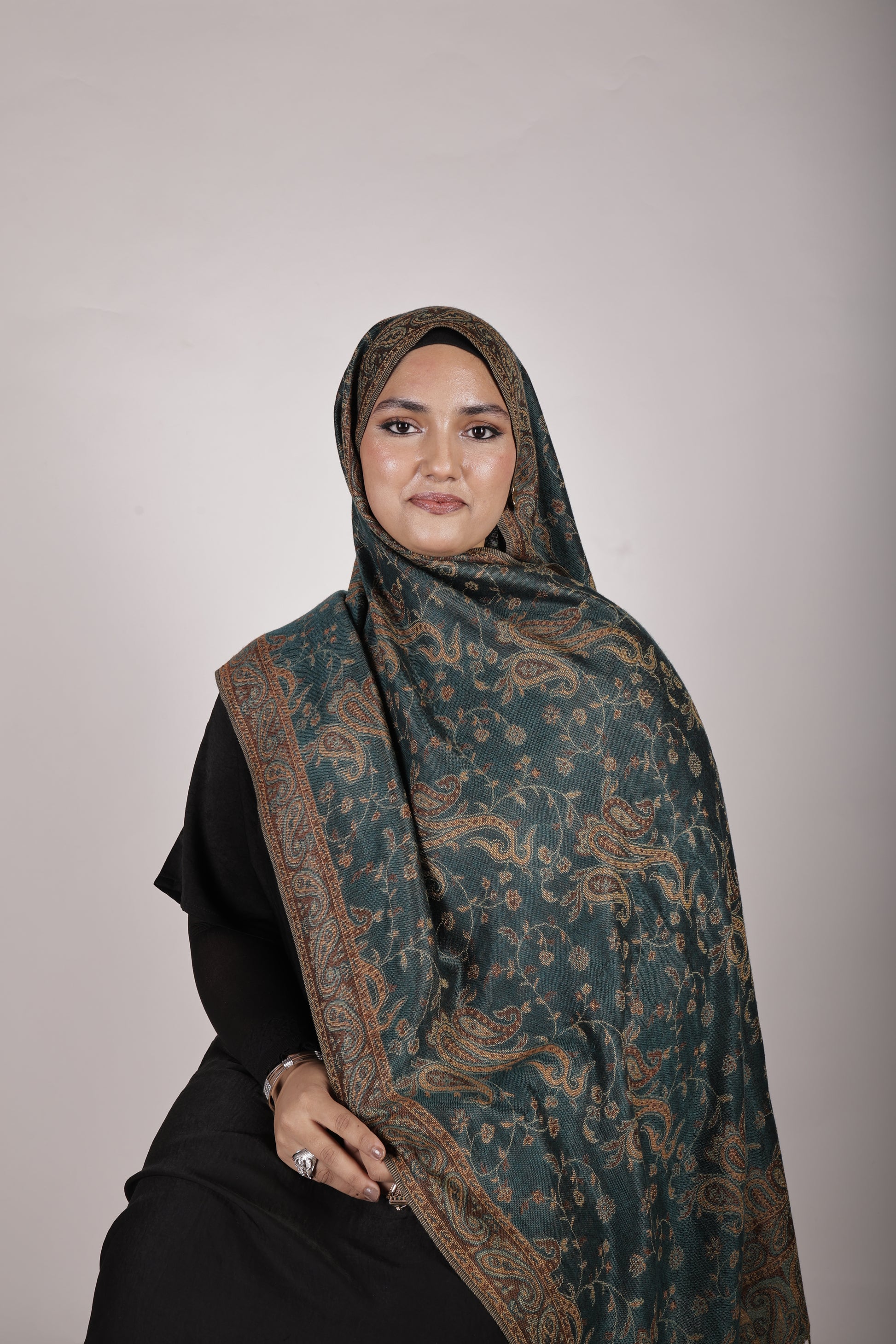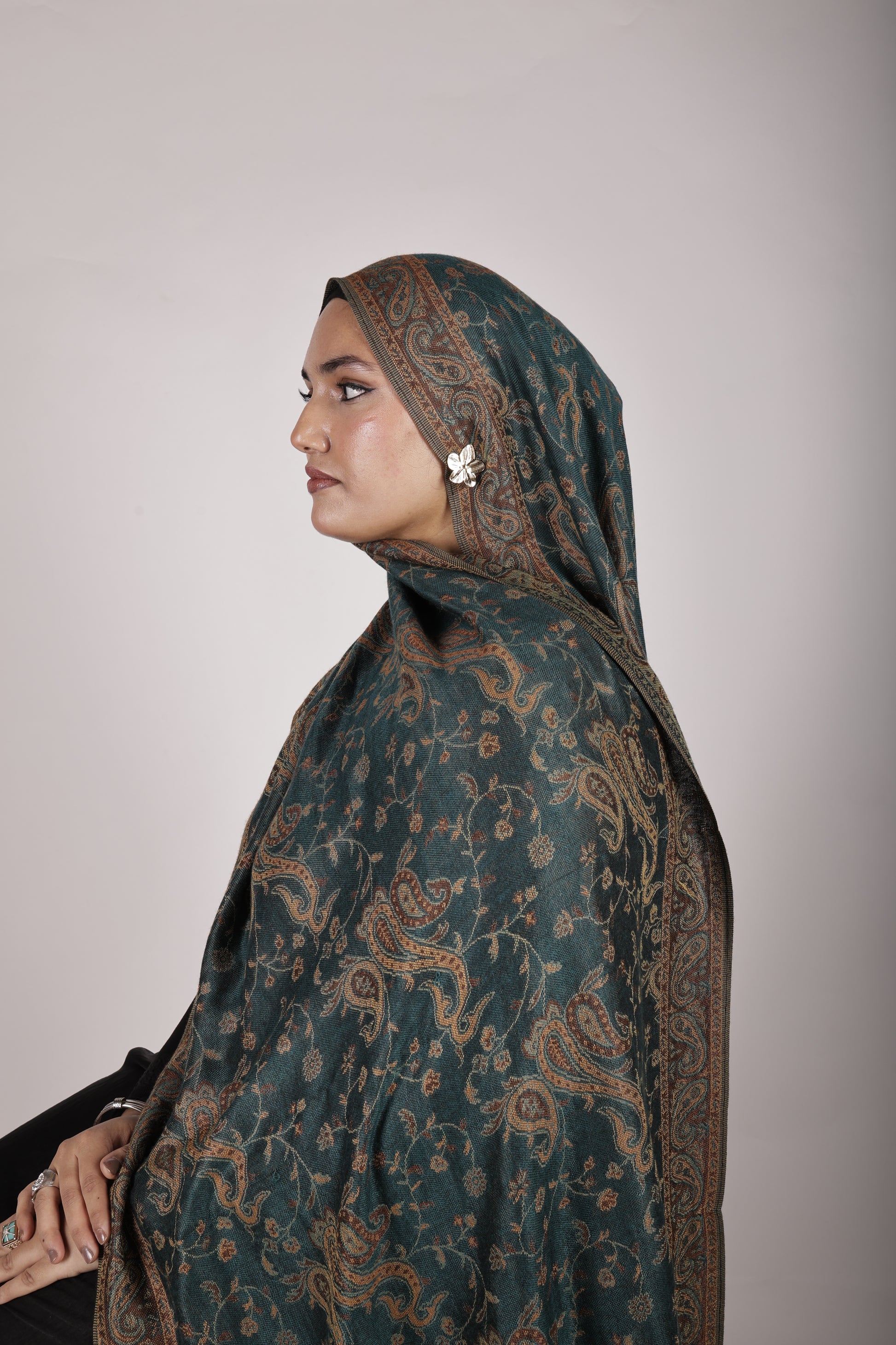 Inspired by the timeless artistry of Kashmir, the Ferozi Pashmina blends rich turquoise tones with warm gold and brown accents. The design reflects traditional Kashmiri elegance, reimagined for modern wear. Soft, warm, and beautifully draped, it adds a refined touch to both everyday and elevated looks.
