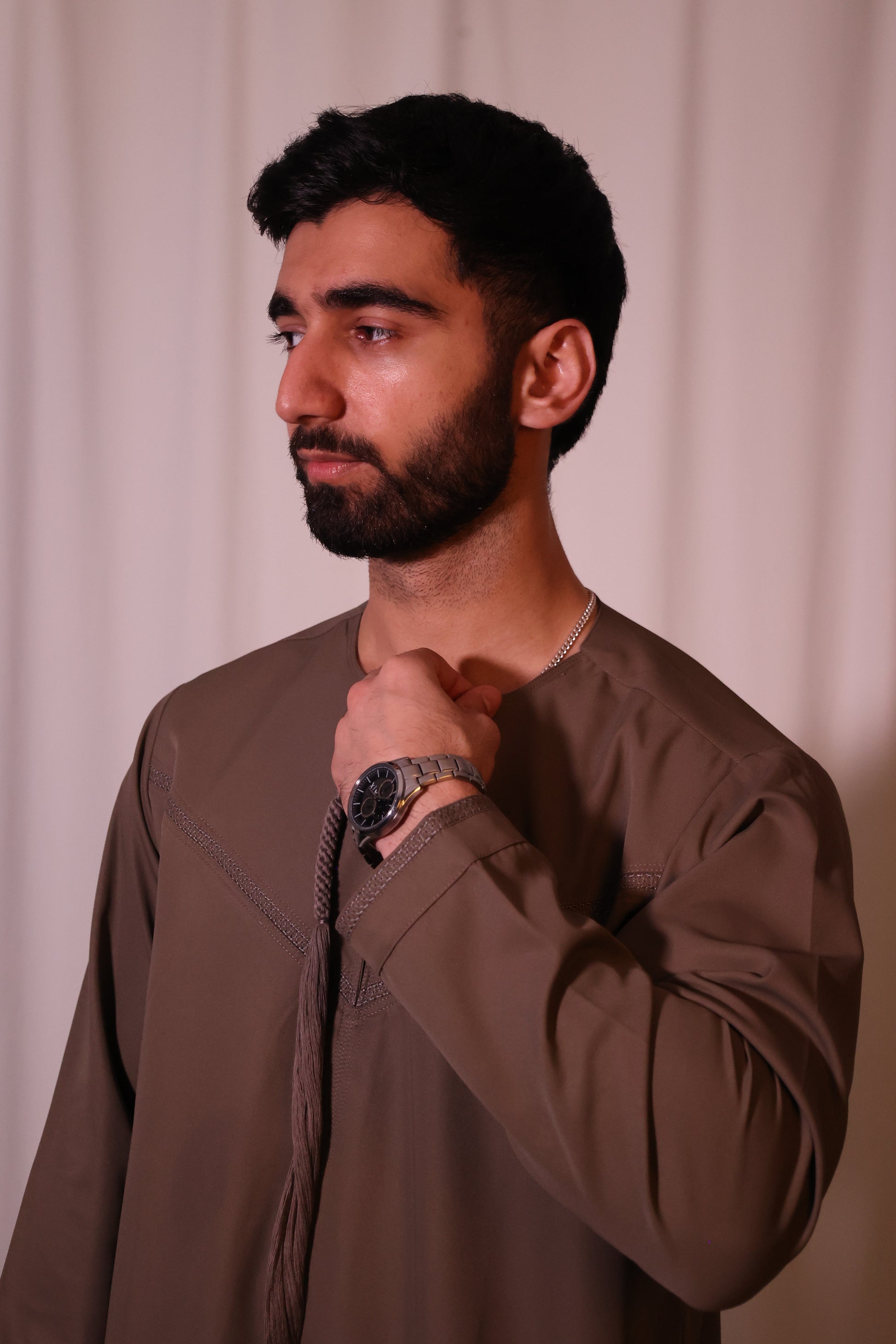 Inspired by the natural hues of the desert, the Desert Taupe thobe is earthy and warm. Its neutral tone exudes subtle elegance, making it a versatile choice for both casual and formal settings.