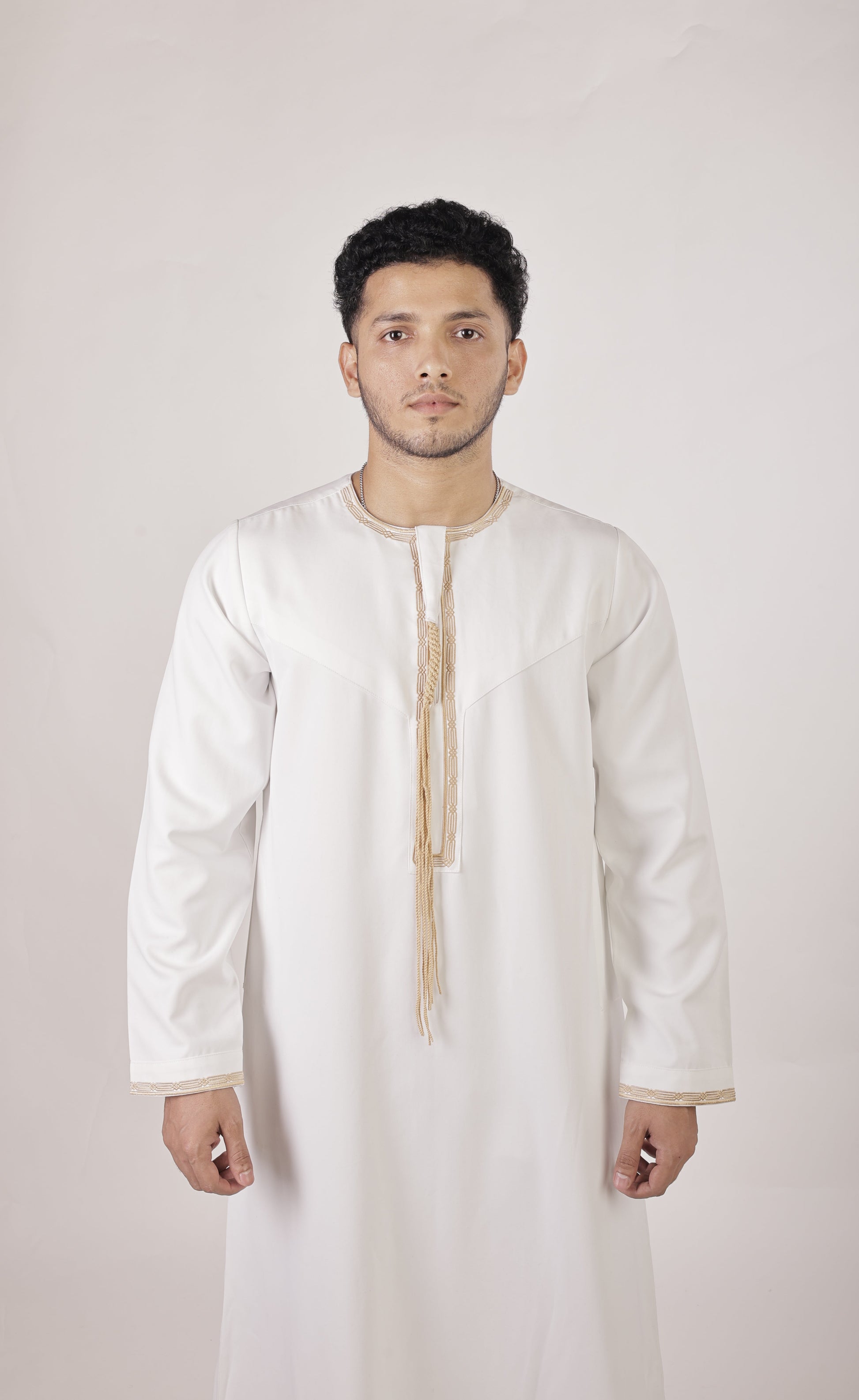 The White and Gold Omani Thobe is the embodiment of elegance and tradition. Crafted from soft white fabric, it features intricate golden embroidery along the neckline and front, paired with a traditional tassel for an authentic Omani touch. The bright contrast of gold against white creates a refined and regal appearance. Perfect for weddings, Eid, or special gatherings, this thobe is designed to help you stand out with sophistication.